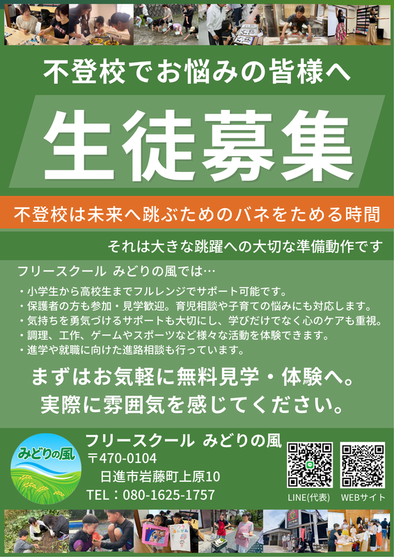 日進市 フリースクールみどりの風についてはこちらをご覧ください。